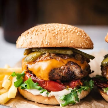 Pain brioché doré, steak de bœuf Angus savoureux, fromage fondant, salade croquante, tomate fraîche et sauce maison. Servi avec ses frites croustillantes et une touche d’oignons caramélisés.